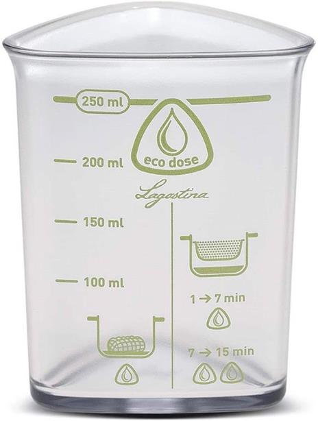 Ecodose Lagostina, misurino liquidi per pentola a pressione. Indica la quantità minima di liquido da inserire durante la cottura. Forma triangolare e pratico bordo a versare per evitare di rovesciare i liquidi. Lavabile in lavastoviglie.